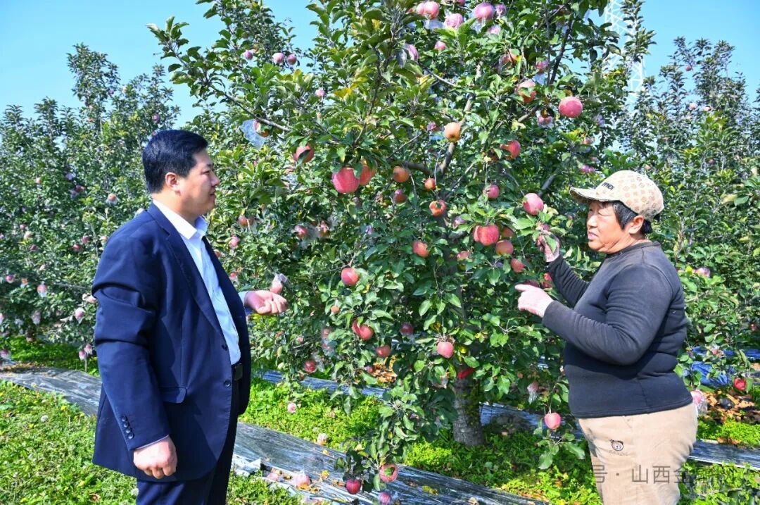 图为11月7日,临猗农商银行北景支行工作人员深入田间,面对面与果农交流,精准对接其金融需求。